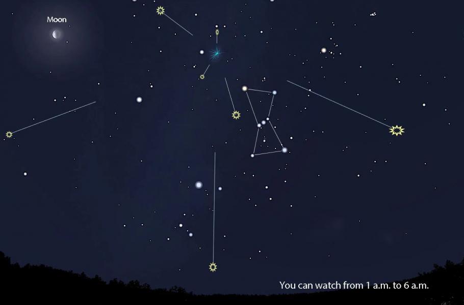 V noci z 21. na 22. října vyvrcholí již pár týdnů narůstající aktivita meteorického roje Orionid. Nejlepší podmínky k jeho sledování nastanou ve druhé polovině noci, kdy se radiant roje – v severovýchodní části souhvězdí Orionu – ocitne výš nad jihovýchodním obzorem. Měsíc tentokrát pozorování rušit nebude, neboť spěje do první čtvrti, a tudíž zapadá už večer.