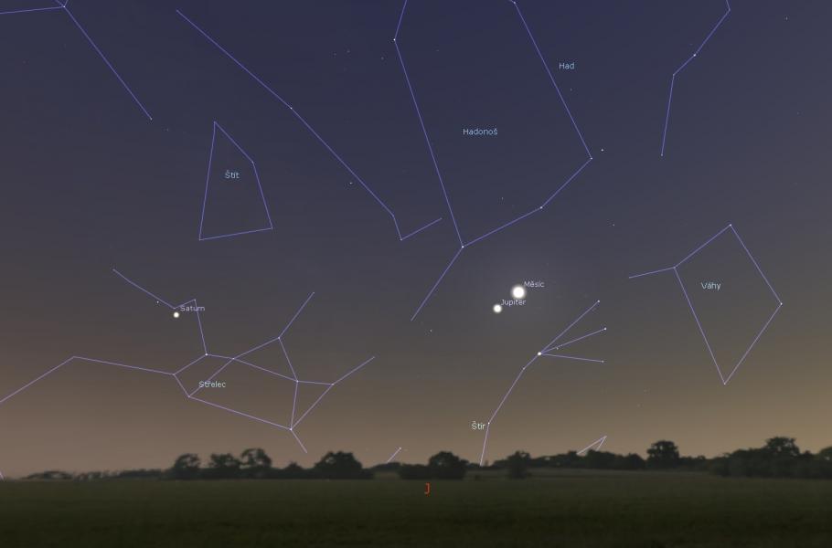 - 9. srpna – seskupení Měsíce, Jupitera a jasné stálice Antares ze souhvězdí Štíra na večerním nebi