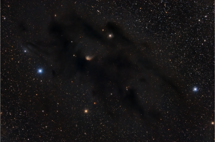 A důvod? Díváte se do míst, kde se na nebi rozprostírá „nejvýraznější“ temná mlhovina souhvězdí Býka. Jedná se o nepravidelný, silně protáhlý tmavý filament dlouhý zhruba 6°, směřující od severozápadu na jihovýchod. Další, avšak mnohem méně zřetelné temné mlhoviny se nacházejí v jeho přímém sousedství, v úhlových vzdálenostech do 5°.