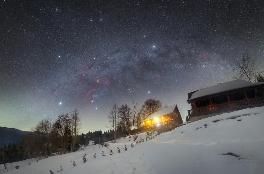 Noční obloha v zimě je mimořádně bohatá na jasné hvězdy. Většinu těch nejnápadnějších naleznete v tzv. zimním šestiúhelníku, jehož vrcholy vytyčují stálice Capella ze souhvězdí Vozky, Aldebaran z Býka, Rigel z Oriona, Sirius z Velkého psa, Procyon z Malého psa a Pollux z Blíženců. Uvnitř tohoto obrazce pak narazíte na dominantu Oriona, naoranžovělou hvězdu Betelgeuze.