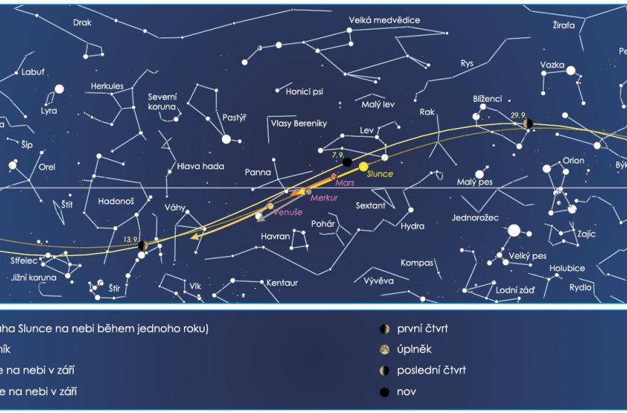 V první polovině měsíce se Slunce nachází ve znamení Panny, 22. září ve 21:21 SELČ vstupuje Slunce do znamení Vah; nastává podzimní rovnodennost, začíná astronomický podzim.