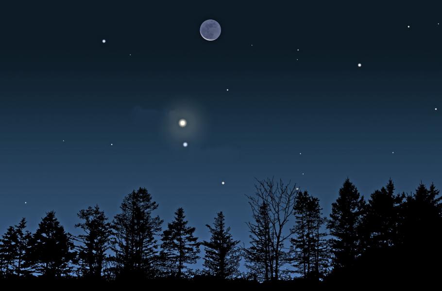 Do třetice na Měsíc upřete zrak 19. září, a to hned dvakrát – z toho poprvé ještě v brzkých ranních hodinách, kdy bude stoupat nad východní obzor v podobě uzounkého srpku pouhé dva dny před novem. V úhlové vzdálenosti 4° směrem na jihovýchod ho totiž bude stíhat zářivá Venuše v doprovodu nápadného Regula ze Lva a v okamžiku východu je bude na nebi dělit proluka 50′. S rozedněním potom můžete Měsíc pustit ze zřetele, ale nikoliv na dlouho. Během dne totiž na obloze doputuje do blízkosti Venuše, a nakonec ji také zakryje. Jelikož ovšem bude mít podobu velmi úzkého srpku, snadno oproti jasnému modrému nebi zanikne.