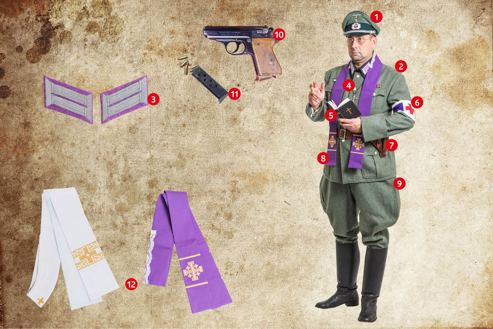 Zobrazený figurant Klubu vojenské historie Tyrnau (Trnava) představuje katolického duchovního, jenž sloužil u Wehrmachtu na východní frontě v roce 1944. U ozbrojených sil třetí říše byl poměr katolických a evangelických (či protestantských/luteránských) kněží přibližně vyrovnaný, což odpovídalo zhruba paritnímu zastoupení těchto dvou hlavních křesťanských vyznání mezi mužstvem. Oficiální označení této profese znělo Kriegspfarrer (válečný farář), též Heeresgeistlicher (armádní duchovní) nebo Feldgeistlicher (polní duchovní).