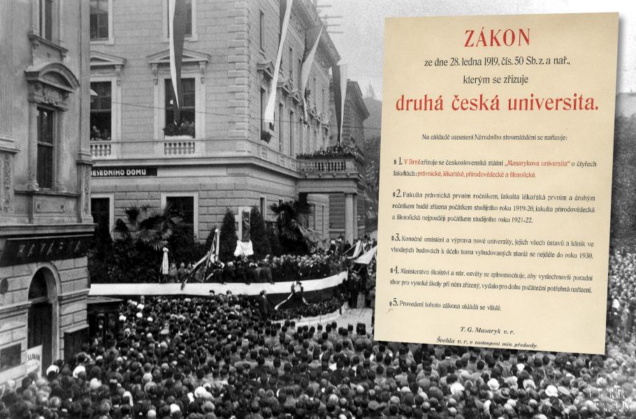 28. ledna 1919 se splnil sen české veřejnosti i čerstvého prezidenta Tomáše Garrigua Masaryka. Československý zákon zamířil svůj prst do centra jihomoravské metropole a zřídil v Brně druhou českou univerzitu, která na počest svého významného stoupence dostala jméno Masarykova.