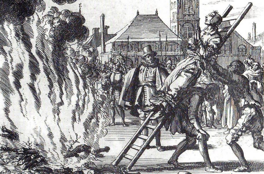 Upalování novokřtěnců v Nizozemsku. Právě krutá perzekuce vedla k jejich migraci napříč Evropou. (ilustrace: Wikimedia Commons, Jan Luyken, PDM 1.0)