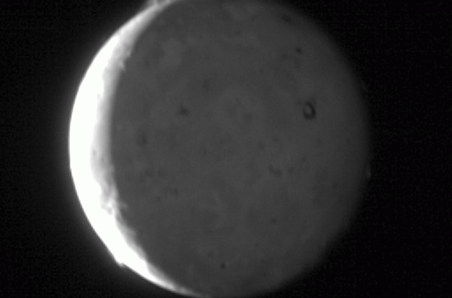Snímek rotujícího povrchu Io; velký červený kruh je kolem sopky Pele