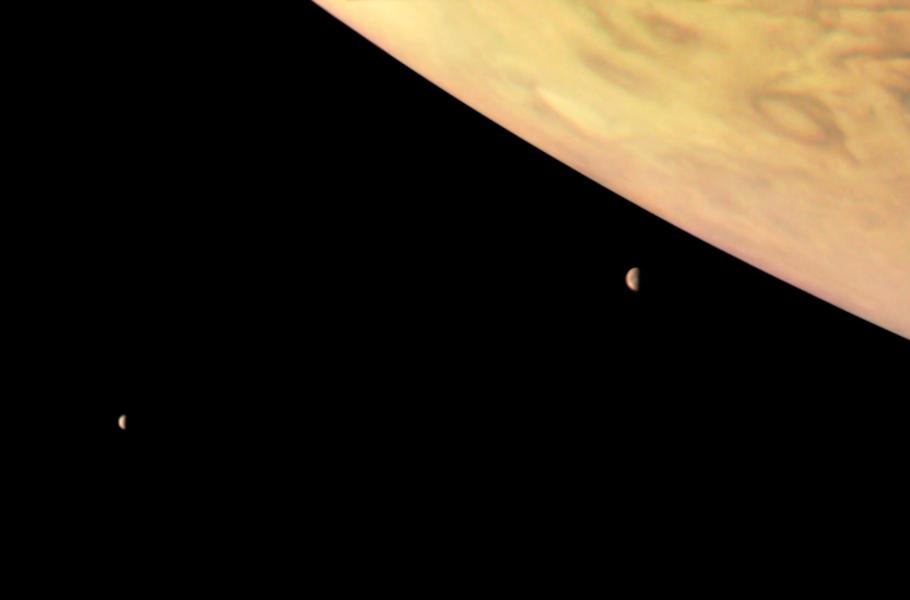 Během svého osmého blízkého průletu kolem planety Jupiter, pořídila sonda Juno pozoruhodný snímek největší planety naší Soustavy a dvojice jejích největších měsíců – sopkami posetého měsíce Io (na snímku blíže k planetě) a měsíce Europa, který podle přesvědčení vědců skrývá obří podpovrchový oceán. Množství vody v tomto oceánu je podle odhadů dokonce větší než součet veškeré vody na Zemi.