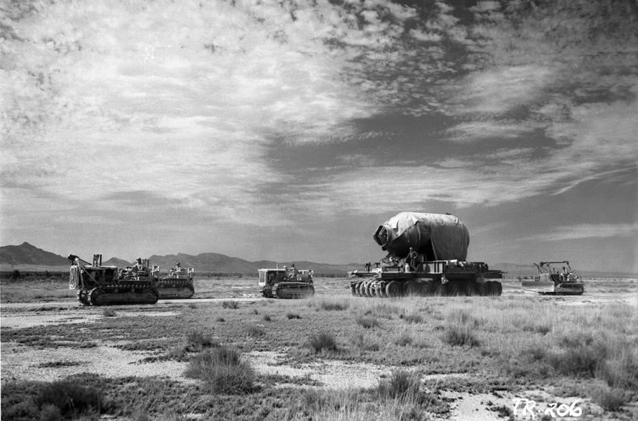 Přeprava 120tunového zařízení Jumbo na místo odpalu historicky prvního jaderného testu. (foto: Wikimedia Commons, DOE, PDM 1.0)