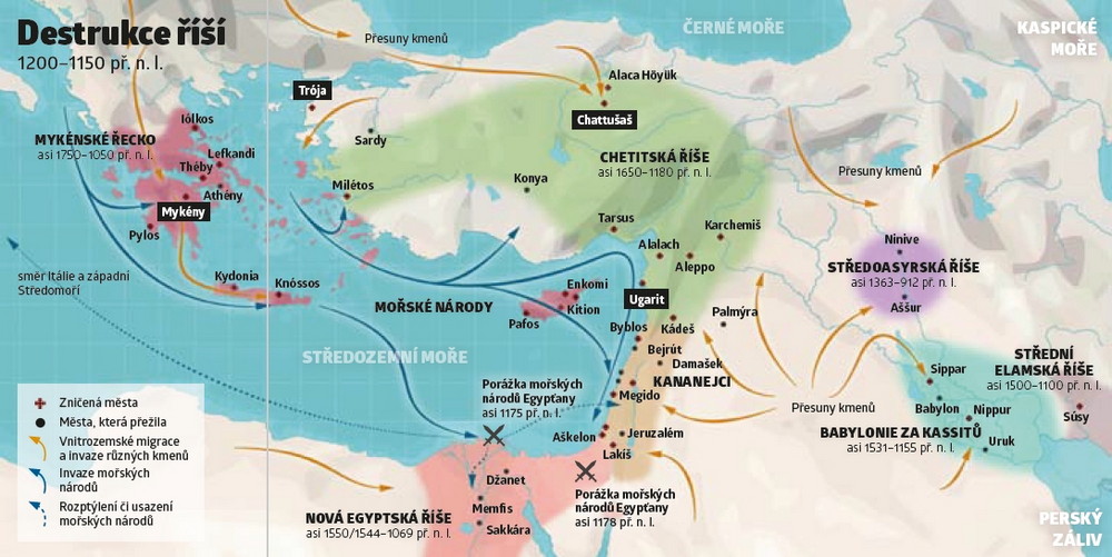 Chetitům se nevedlo o mnoho lépe. Obyvatelé se po politických otřesech stáhli na venkov a nechali města opuštěná. Čtyřicetitisícová metropole Chattušaš padla a podobně skončila řada dalších významných sídel. Staly se jediným důvodem katastrofy mořské národy a vnitřní sváry? Je pravděpodobné, že nikoliv: Chetity i Mykéňany nejspíš postihla kombinace více faktorů, přírodních i společenských.