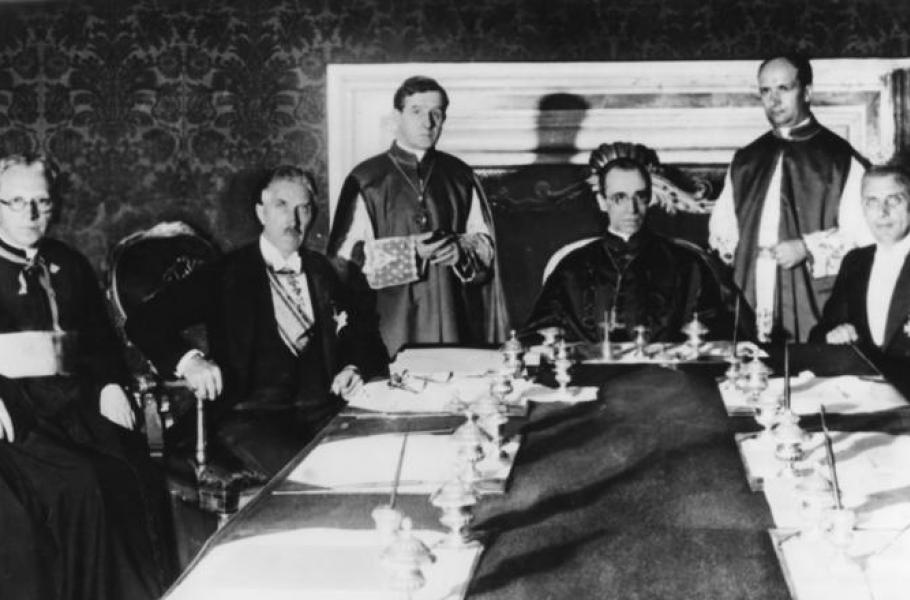 Pacelli a další zástupci církve roku 1933 při podpisu úmluvy s Třetí říší - přítomen je říšský kancléř Franz von Papen a ministr vnitra Rudolf Buttmann. (foto: Wikimedia Commons, Bundesarchiv, Heinrich Hoffmann, CC-BY-SA 3.0)