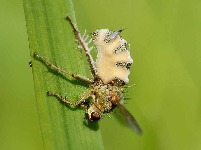 Už dlouho víme, že někteří parazité dovedou manipulovat chování svých hostitelů. Extrémním příkladem jsou v tomto směru houby hmyzomorky ze skupiny zygomycet (spájivých hub). Hmyzomorka muší (Entomophthora muscae) například dokáže dokonale zneužít sexuální pud hostitelských much. Prokázal to tým, který vedl ekolog Andreas Naundrup z dánské Kodaňské univerzity. Vědci zjistili, že když je moucha nakažena touto houbou, parazit ji donutí vyletět na vysoko položené místo, tam ji nechá zemřít a vytvoří velice silné afrodiziakum, které přiláká zdravé sexuchtivé samce much.