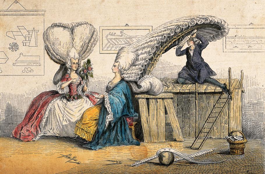 Zejména v dámském provedení se z paruk stávaly komplikované výtvory – a také terč vtipů. (ilustrace: Wikimedia Commons, Wellcome Images, CC BY 4.0)