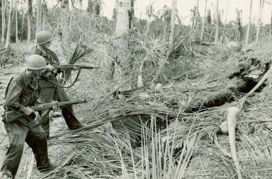 Američtí pěšáci vyzbrojení puškami M1 Garand kontrolují japonský bunkr na Nové Guineji. (foto: Wikimedia Commons, U.S. Army Military History Institute, PDM 1.0)