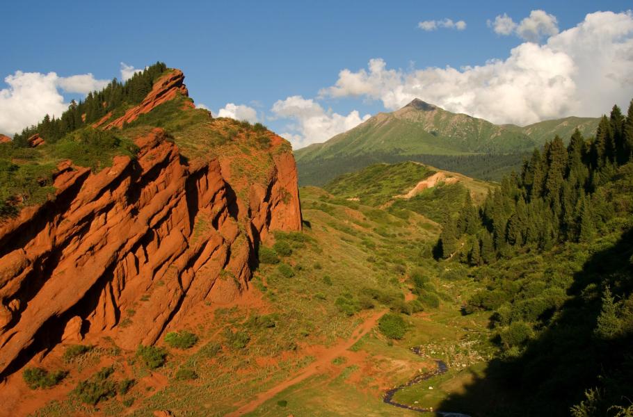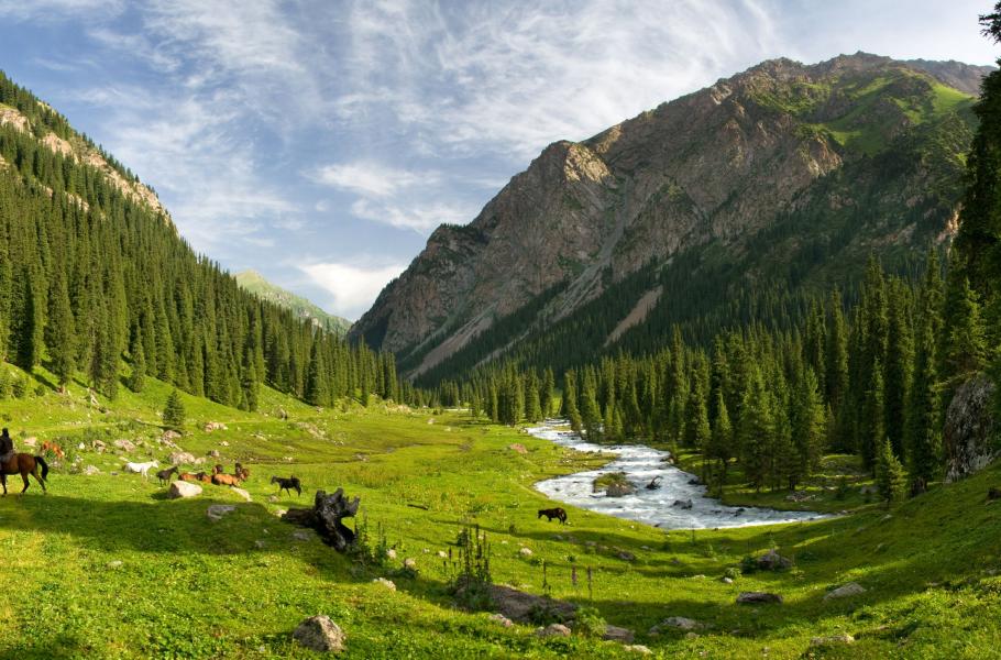 Vysoké hory, nebesky modrá jezera, stáda polodivokých koní a bělostný třpyt jurt. To je typický obrázek krajiny v Kyrgyzstánu, kde hory přesahující výšku 3 000 metrů nad mořem zabírají třetinu země. Esenci této krajiny můžete nasát na treku k jezeru Alakol