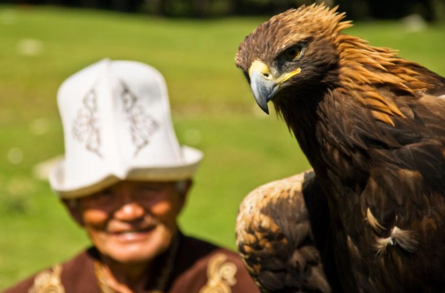 Druhý den ráno vybíháme na kopeček. Musíme zvěčnit Sedm volů ve světle vycházejícího slunce a pokochat se výhledem na hory, do jejichž srdce dnes máme namířeno. Cesta vede podél potoka po ještě vyježděné cestě a míjí desítky jurt. Jedna z nich nás na první pohled upoutá. Stavba je sice totožná s ostatními jurtami, ovšem před jejím vchodem není uvázaný pes, ale orel. Sokolnictví (i když v případě orlů by se snad mělo říkat „orlovnictví“) je stará kyrgyzská tradice a dobří sokolníci vždy byli váženými členy společnosti. Majitel orla, usměvavý vrásčitý děda, je hned připraven k akci. Jakmile mu zaplatíme domluvenou odměnu, převléká se do vyšívaného kroje i tradičního plstěného klobouku a předvádí se s dravcem před našimi objektivy. Evidentně nejsme první fotografové, jejichž pozornost si získal, což dokazuje mimo jiné renomovaným zahraničním časopisem, kde je zvěčněn na titulní straně. S orlem to ale umí a sbírka několika medailí ze sokolnických soutěží dokládá jeho schopnost dorozumět se s důstojným dravcem.