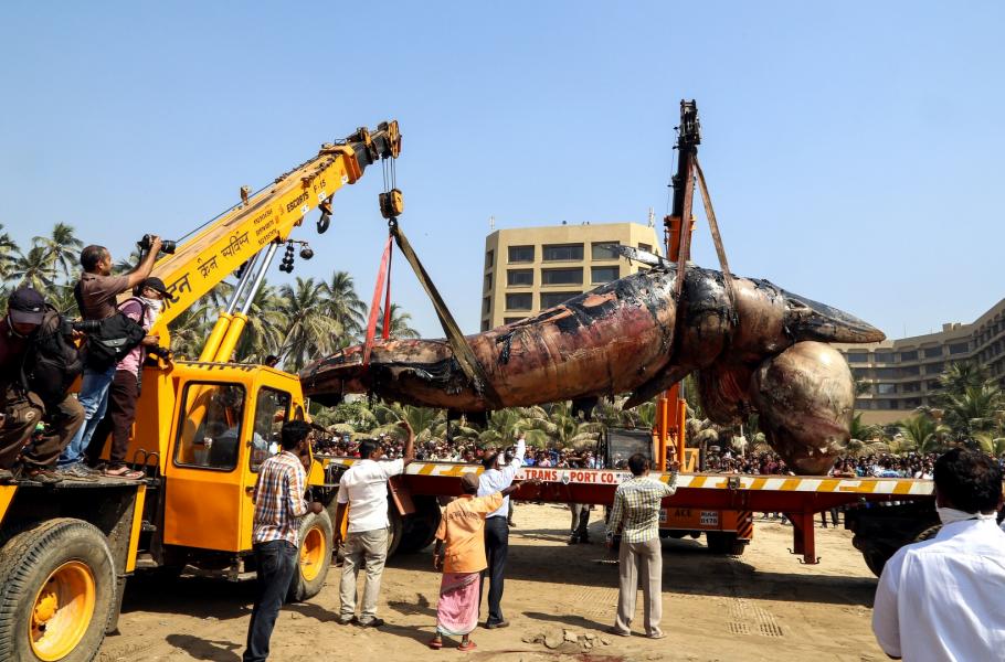Arabské moře na konci ledna vyplavilo na oblíbenou indickou pláž Juhu poněkud netradiční dar – mrtvé tělo plejtváka Brydeova dlouhé bezmála 12 m a vážící přibližně 20 tun. V rozkládajícím se korpusu se pomalu hromadil plyn a hrozilo, že exploduje. Místní ochranáři proto torzo nejprve přímo na pláži „vypustili“ a následně jej přemístili pomocí dvou jeřábů. Podle zoologů byl plejtvák mrtvý přibližně dva dny. Plejtvák Brydeův patří mezi středně velké druhy, dosahuje obvykle délky 9 až 13 metrů, přičemž zvlášť velcí jedinci dorůstají až 15,5 metru. Hmotnost dospělých kusů se pohybuje mezi 12-25 tunami.