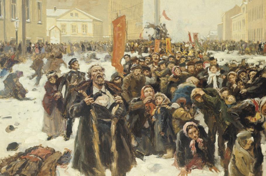 Na sto padesát tisíc dělníků s rodinami, které vedl pop Gapon, se 22. ledna 1905 (dle v Rusku platného kalendáře 9. ledna) vydalo za zpěvu chorálů k petrohradskému Zimnímu paláci. Téměř mystický průvod, který připomínal náboženské procesí, chtěl požádat báťušku cara o zlepšení pracovních podmínek. Ještě než stačil své ponížené prosby vyslovit, ozvala se ohlušující střelba.