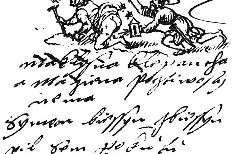 Zápis s připojenou kresbou:„Má klisna klepouchá /a má žena poctivosti nemá. /Pil sem pokutu. Simeon Běšín z Běšin“