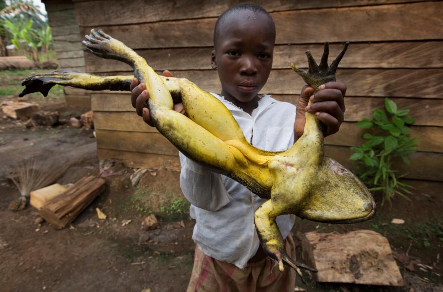 Veleskokan goliáší, největší známý druh žáby, žije na malém území v Kamerunu. Místní ho rádi loví a prodávají jako pochoutku.
