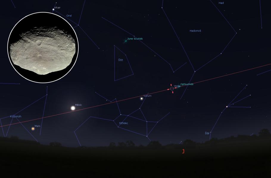 Na počátku června Vesta dosáhla jasnost 5,7 mag, takže aktuálně je na hranici viditelnosti očima. Pro pozemské pozorovatele se jeví jako velmi světlá - její odrazivost je asi 43 procent, zatímco Měsíc má jen asi 12 procent. Mnohem snáz a rychleji ji ovšem uvidíte s dalekohledem s velkým zorným polem. Začněte u Saturnu a vydejte se od něj 4° na severozápad ke hvězdě Polis ze souhvězdí Střelce. Jedná se o stálici čtvrté velikosti, takže ji určitě nepřehlédnete. Pak stačí přístroj přesunout zhruba 4° směrem na sever a v zorném poli se coby světlý bod objeví i Vesta.