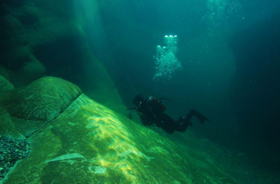 Noříme se pod vodu a zjišťujeme, že laguna, která vypadala mělce, strmě klesá do hloubky deseti metrů a svažité dno plné třpytivých kamenů nás dovádí k monumentální skalní bráně. Strmému podvodnímu kaňonu vévodí v hloubce asi pěti metrů přírodní útvar připomínající hlavu obří ryby. Ranní slunce osvětluje pouze vstup do podvodního chrámu a my zažíváme přechod do jeho přítmí a klidu. Přestože jsme tímto místem uneseny, hlavní atrakci máme ještě před sebou. Po překonání dvacet metrů dlouhého kaňonu absolvujeme asi 200 metrů suchou nohou s výstrojí na zádech po kluzkých kamenech do dalšího „jezírka“ s průměrem asi třiceti metrů a hloubkou přesahující dvě desítky metrů! Na závěr si vychutnáváme devět metrů vysoký vodopád řítící se do samostatné menší tůňky schované v objetí skal.