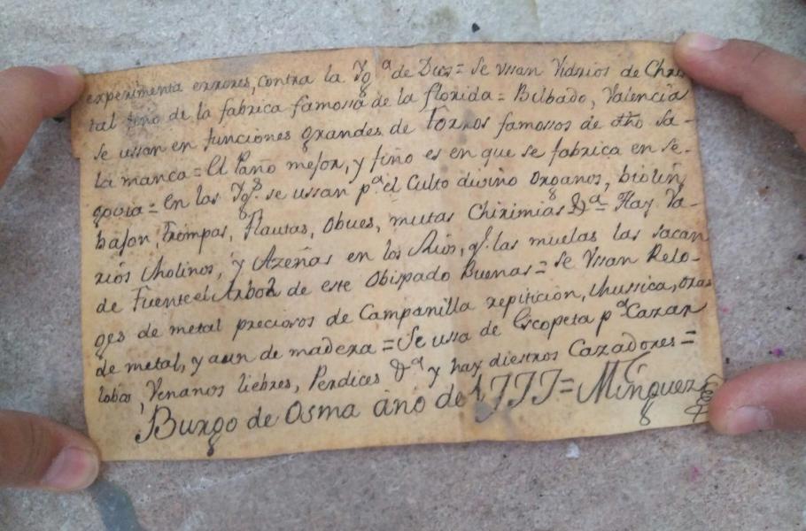Za jeho života řádily v okolí tyfus a malárie, hlavní plodiny představovaly pšenice, žito, ječmen či oves a značné oblibě se vedle karet těšily také míčové hry. Kněz si pochvaloval i sklizeň vína, jež se toho roku údajně velmi vydařila. Originál zprávy byl poté odeslán španělskému arcibiskupovi a kopie se vrátila do útrob sochy.