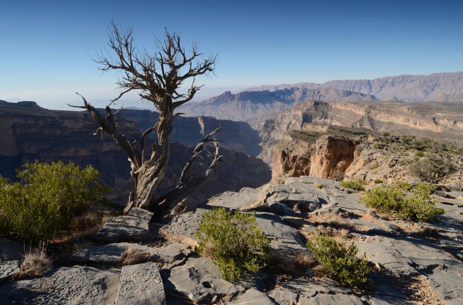 Na rozdíl od našich geografických podmínek zde s rostoucí nadmořskou výškou překvapivě přibývá stromů a jejich velikost se zvětšuje. Je to dáno ochlazením teplot v horách a tvorbou mlh, která je zdrojem alespoň minimální vláhy pro růst stromů, nebo spíš bizarních přerostlých bonsají. A tak je možné cestou na nejvyšší „sluneční“ horu Ománu Džabal aš-Šám (3 009 metrů) procházet porostem několikametrových tují (zeravů), které až nápadně připomínají africkou savanu. Pohled do hlubin nedalekého „arabského Grand kaňonu“ neboli vádí Ghul vyvolává nelítostné závratě. Jeden krok před vámi se otevírá tisícimetrová propast.