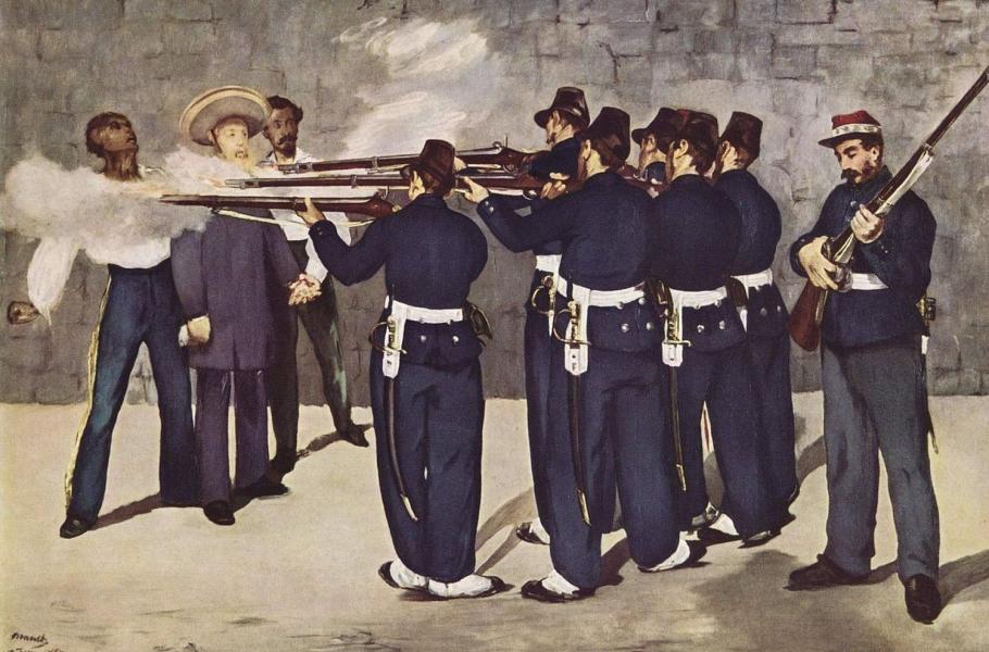 Poprava císaře Maxmiliána, vedle něho generál Miramón (po císařově levé ruce) a Mejía. Obraz fracouzského malíře Edouarda Maneta. (foto: Wikimedia Commons, CC0)