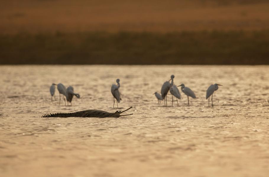 Další den jsme se na řeku vypravili později odpoledne a při západu slunce jsme mohli vidět, jak gaviálí matka chrání své hnízdo a mladé ratolesti před nájezdem páru šakalů. Ubránila je celkem s přehledem a výtržníci se museli spokojit se zbytky skořápek. Šakalové po konfrontaci se zubatou tlamou nekompromisní samice vyklidili prostor a po chvíli pokračovali „o dům dál“. Stejně jako my.