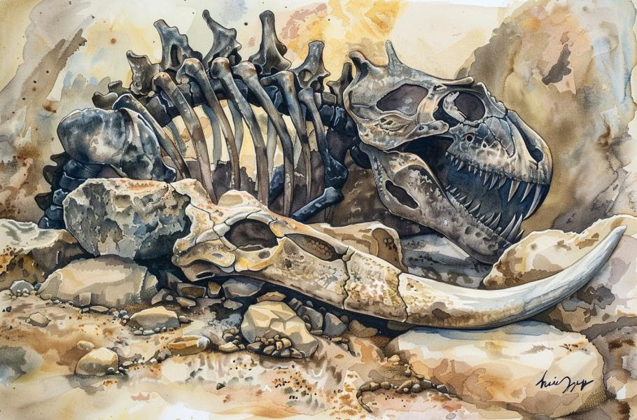 Humanističtí vzdělanci považovali mamutí kosti za pozůstatky biblických obrů. Zkamenělinám hlavonožců se říkalo „čertí drápy“ a měly pomáhat kojícím ženám. (ilustrace: Midjourney AI, PDM 1.0)