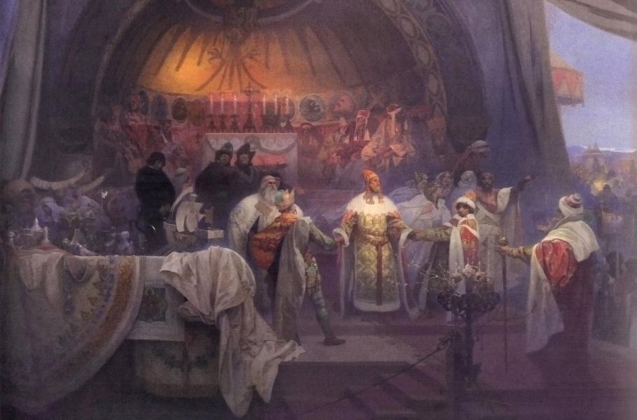 Svatba Kunhuty Braniborské s uherským princem Bélou, na kterou Přemysl Otakar II. pozval všechny okolní slovanské panovníky. Postavy jsou zobrazeny v královském stanu před svatební kaplí. Jedná se o Přemyslovu osobní kapli, neboť na zdi můžeme vidět jeho erb – orla s roztaženými křídly. Přemysl sám je uprostřed obrazu, vítá dva nové hosty. Ostatní panovníci stojí okolo krále.