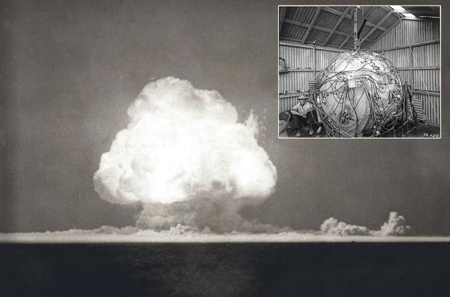 Záběr výbuchu z 16. července 1945 v Novém Mexiku – nechybělo ale zas tak moc, aby atomovou bombu sestrojilo i nacistické Německo. Ve výřezu první atomová bomba odpálená během testu Trinity. (foto: Shutterstock + Wikimedia Commons, Federální vláda Spojených států amerických, CC0)