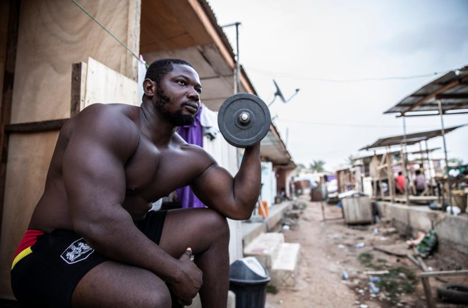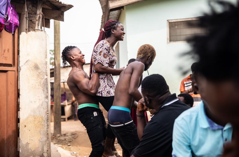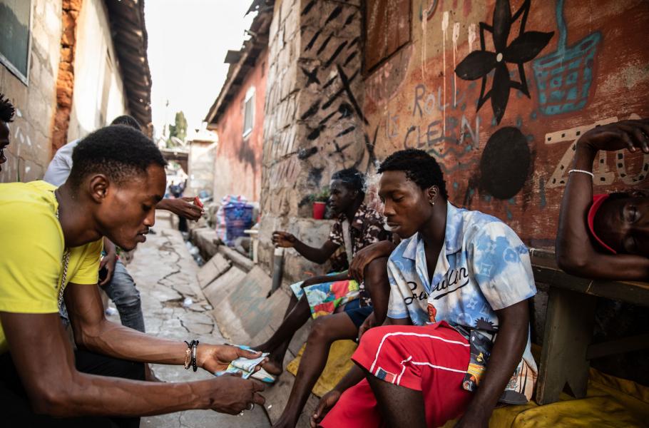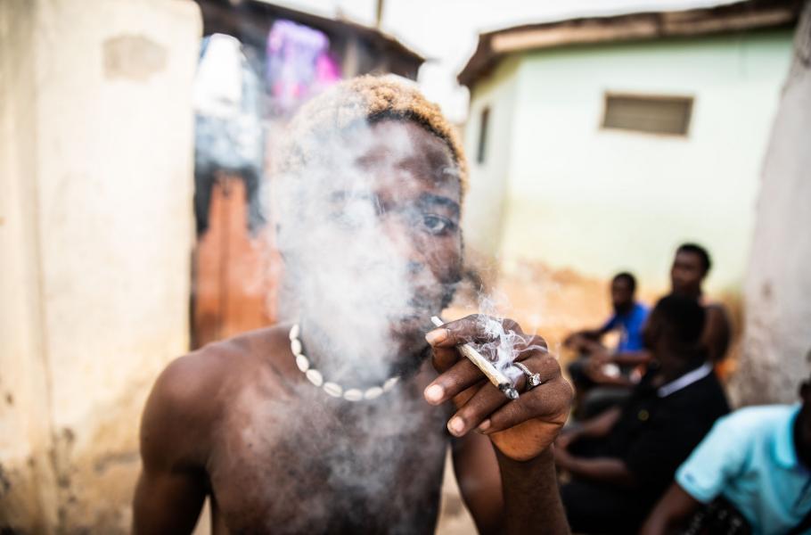 Jo, mladých je tam spousta. Hrozně podobné focení jsem dělal na Jamajce, kde vedou úplně stejný život. Kdybyste na chvíli zapomněl, kde jste, vůbec nepoznáte rozdíl. Poslouchají hudbu streamovanou z mobilu přes bluetooth do repráku, posedávají venku, hulí trávu a řeší, že nemají peníze. Naštěstí v Ghaně nejsou zbraně, protože je známá extrémně aktivní a funkční policií. Dalo by se říct, že jde skoro o policejní stát. Vedle v Nigérii mají zločinnost obrovskou a otázka zní, jestli bych si tam takové focení vůbec mohl dovolit – a pokud ano, jestli bych se taky vrátil. Ale v Ghaně lidi policii respektují a bojí se jí. Všichni mi říkali: „Chceš vidět zbraně? Jeď se mrknout do Nigérie.“