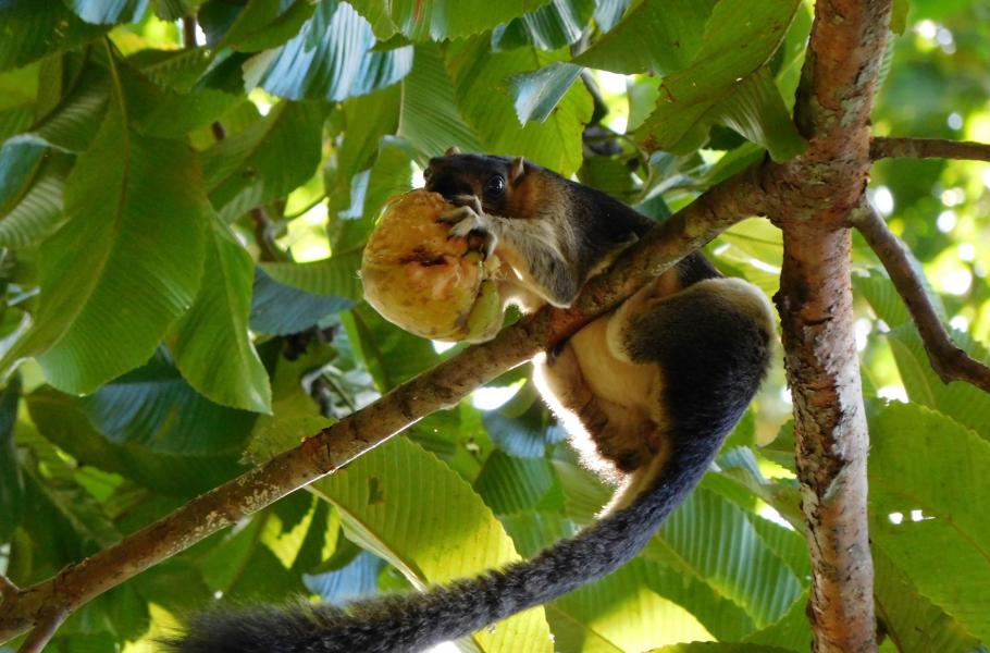 Veverka Prévostova (na fotce zřejmě poddruh Callosciurus prevostii pluto) je stejně jako všechny veverky prvotřídním stromovým akrobatem. Způsob, jakým se zachytila drápky zadních nohou a ve visu hlavou dolů konzumovala zralý plod, byl naprosto suverénní. V lese jsou tyto veverky významnými distributory stromových semen. (foto: © Marek Telička)