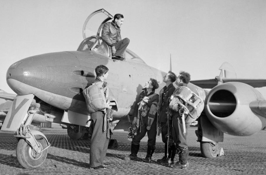 Velitel letky Dennis Barry, jeden z velitelů letky č. 616, v kokpitu letounu Meteor EE227/YQ-Y v Manstonu. (foto: Wikimedia Commons, Imperial War Museums, IWM Non Commercial Licence)