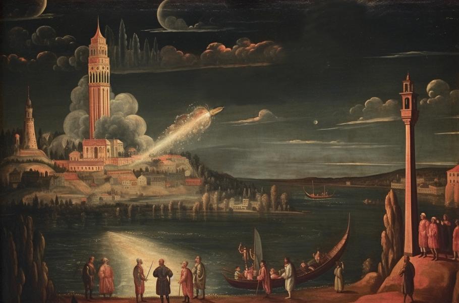 Inženýr, dobrodruh a vynálezce Lagâri Hasan Çelebi možná v roce 1633 připravil velkolepou podívanou – let rakety s lidskou posádkou. (ilustrace: Midjourney AI, CC0)
