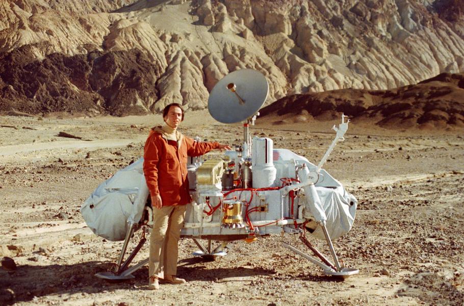 Astronom Carl Sagan s modelem přistávacího modulu Vikingu. (foto: Wikimedia Commons, NASA/JPL, PDM 1.0)
