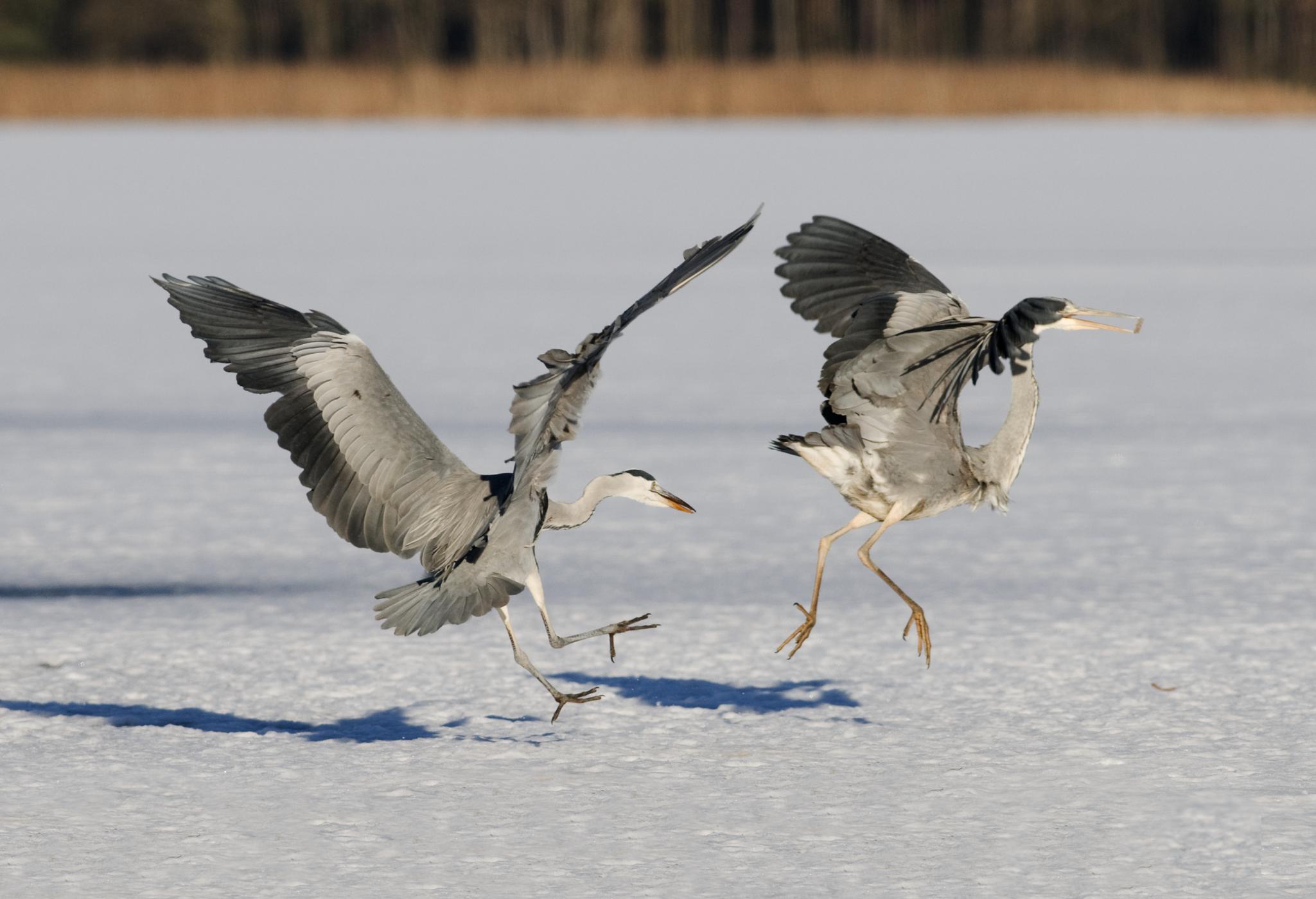 V hledáčku se náhle mihne stín a pár metrů ode mne usedá volavka popelavá (Ardea cinerea). Chvíli váhá, za pár minut se rozhodne jít přímo ke krytu. Asi ji upoutalo „oko“ pětistovky, kouká mi do objektivu, do hledáčku se celá nevejde. Pak zamíří ke zmrzlým kaprům, ale bez úspěchu se snaží utrhnout zobákem kus tkáně. Po několika marných pokusech poodejde stranou a znehybní v typickém volavčím postoji s esovitě zataženým krkem.
