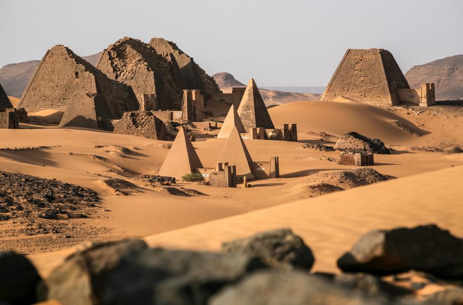 V Súdánu se dochovala rozsáhlá pyramidová pole: Největší leží u dnešního města Meroe a čítá tři skupiny celkem 352 hrobek, z toho 50 královských. Ubytovat se můžete v luxusním hotelu s výhledem přímo na starověké pohřebiště, nebo si v nenáročné variantě nedaleko rozbít stan. Jde patrně o jedno z mála míst, kde potkáte turisty – Meroe leží jen několik hodin jízdy od Chartúmu a Súdánci o svátcích rádi míří na výlety za minulostí. Skupiny místních, kteří vyrazili na piknik, spolu s nepříliš usilovnými prodejci suvenýrů dotvářejí kolorit špičatých, ostrých a ve srovnání s egyptskými příbuznými vlastně drobných hrobek.