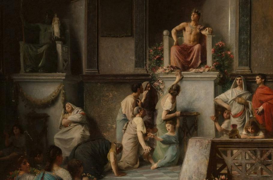 Šílený císař Caligula se nechává uctívat jako bůh na obraze Emila Levyho z 19. století. (ilustrace: Wikimedia Commons, Émile Lévy, PDM 1.0)