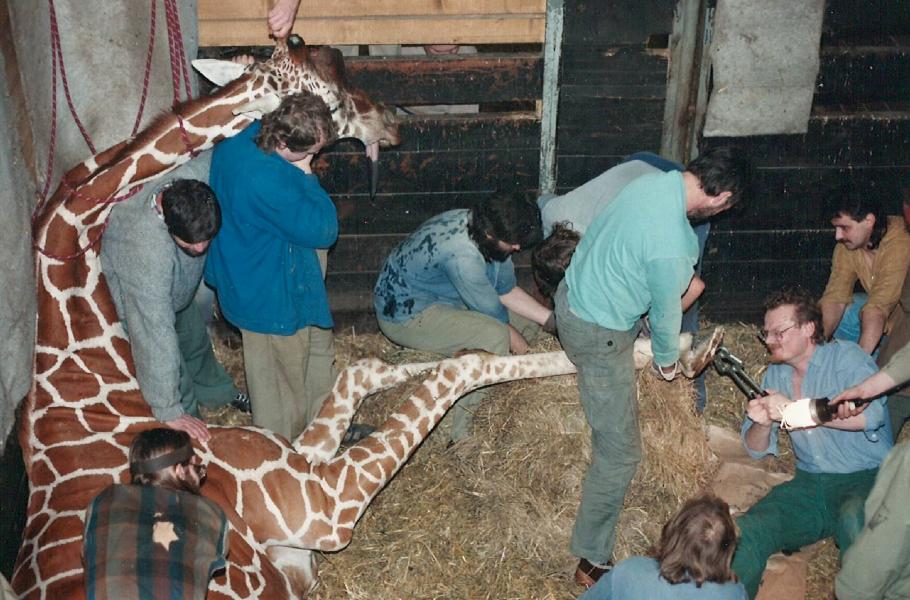 Korekce paznehtů či kopyt skutečně patří k běžné práci, ovšem pedikúra žirafích paznehtů má svá úskalí. Základním krokem je uspání zvířete a jeho položení na zem. K tomu je opravdu potřeba osmi až deseti lidí, přičemž musí jít o secvičený tým. Žirafu je nejdřív nutné zklidnit speciálními preparáty, které se foukačkou nastřelí do svalu. Na krk se jí nasadí dvě lana a zvíře se pomalu směruje do rohu uspávacího boxu, na jehož podlaze je hluboká podestýlka, přirovnatelná k měkké matraci. Jakmile začne uspávací látka účinkovat, musí tři pracovníci, kteří žirafu podpírají, pomalu ošetřovaného sunout po stěně boxu až do polohy vleže. Až pak je možné opravit žirafě fazonu na paznehtech, ošetřit ji, nebo odebrat krev.