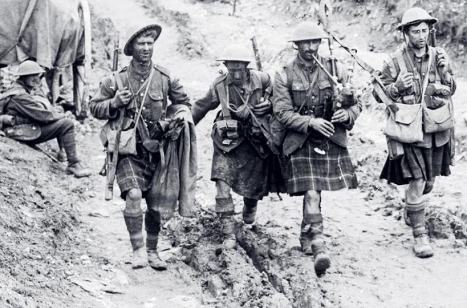 Dudy zněly na všech bojištích, kam vkročila noha vojáka Jeho Veličenstva. Za celou první světovou válku v ní sloužilo pět milionů mužů rozdělených do stovek batalionů, z nichž každý sedmý vycházel ze skotské tradice. S tou byli neodmyslitelně spjati právě dudáci, mezi jejichž úkoly patřilo hrát k pochodu nebo oznamovat denní povinnosti, ale hlavně za bitvy povzbuzovat vojáky k útoku.