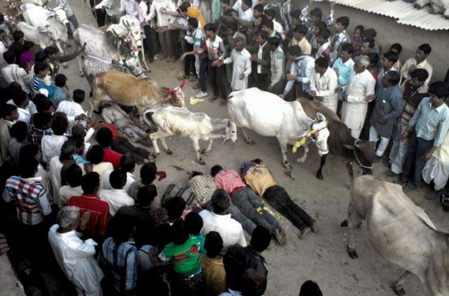 V Indii se konal rituál, při němž se mladí muži nechávají pošlapat posvátnými krávami. Odměnou jim má být bohatství a štěstí