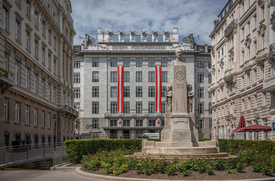 Památník ekonoma Georga Cocha před centrálou rakouské poštovní spořitelny ve Vídni. (foto: Wikimedia Commons, Marek Śliwecki, CC BY-SA 4.0)