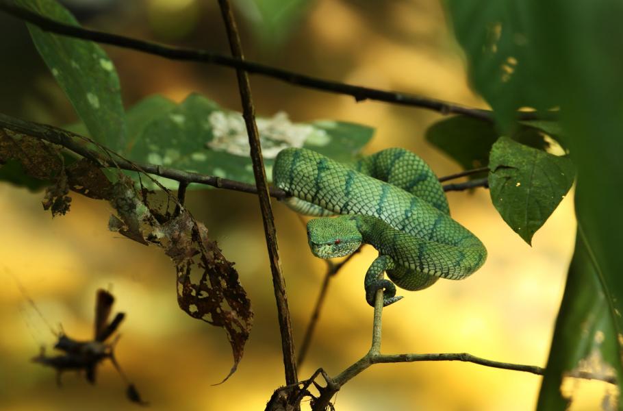 Hned toho dne odpoledne jsme s Attehem prošli okolí centra. Nad řekou Segama létali barevní lobošové žlutočerní (Eurylaimus ochromalus) a vlaštovkám podobní klechové menší (Hemiprocne comata), kousek od nás si na plot sedla vlha červenobradá (Nyctyornis amictus) a i ten slibovaný chřestýšovec Waglerův (Trimeresurus wagleri) na větvi nad potokem pořád ještě ležel. S dalším vysněným druhem, kterým je Danum Valley proslulé, žabkou létavkou černoblannou (Rhacophorus nigropalmatus), to už bohužel nebylo tak jednoduché.