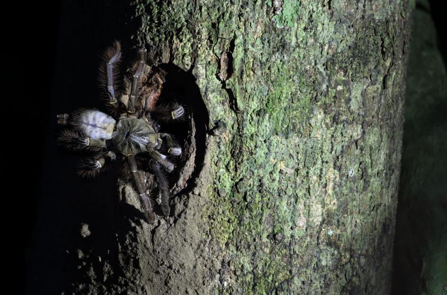 Noční vycházky kolem tábora stály nicméně i tak za to. Viděli jsme sklípkana Everettova (Phormingochilus Everetti), jenž i ze vzdálenosti několika metrů budí pořádný respekt, slyšeli (bohužel jen slyšeli) jsme další slavnou bornejskou žábu pablatnici nosatou (Megophrys nasuta), na větvi přímo nad cestou narazili na spící pitu modrohlavou (Pitta baudii) a přímo v kempu jsme sledovali místní celebritu sovu ketupu malajskou (Ketupa ketupu).