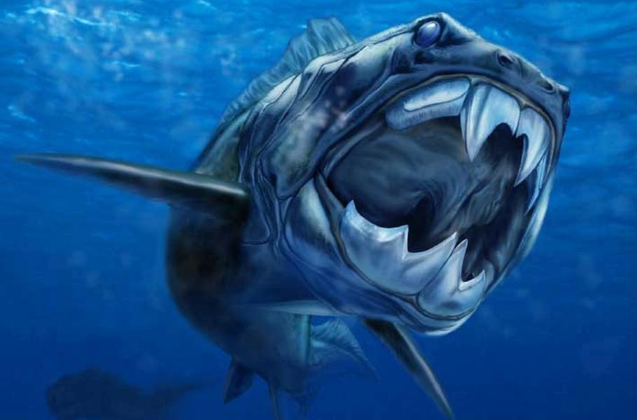 Asi před 380 miliony let, v období devonu, brázdil oceány na území Severní Ameriky, Afriky a Evropy obří pancířnatec (prvohorní rybovitý obratlovec) Dunkleosteus terrelli. Dosahoval délky až 10 metrů a síla jeho čelistního stisku přesahovala dle odhadů 5 400 Newtonů, čímž překonával například současnou hyenu. Na špičce jeho zubních plátů, které u těchto primitivních obratlovců nahrazovaly zuby, však síla stisku mohla údajně dosáhnout fantastické hodnoty 36 000 Newtonů na jeden čtvereční palec. Tím se vyrovnal i tyranosaurovi a překonával největší krokodýly mořské.