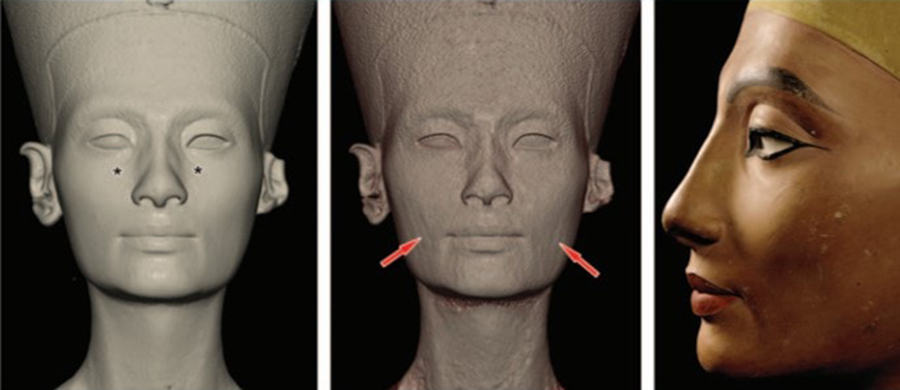 Jiní vědci by však za pravost sochy dali ruku do ohně. Němečtí odborníci ji v roce 2009 skenovali pomocí počítačové tomografie a odhalili, že na vysekaném vápencovém jádře spočívají vrstvy hlíny, jimiž sochař dílo doladil – mohl si tak pohrát s detaily, které se bronzovým dlátem vytvářejí v kameni jen těžko. Chemický rozbor pigmentu navíc potvrzuje, že je skutečně přes tři tisíce let starý. Historici umění dále tvrdí, že neobvyklý styl zhotovení busty patří k Achnatonově náboženské revoluci, jež proměnila zavedené způsoby zobrazování. A chybějící oko? Prostě se ztratilo.