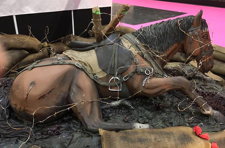 Oběťmi válek ale nebývají zdaleka jen lidé – ve všech světových konfliktech trpí také spousta zvířat. Právě na tento fakt se poněkud méně obvyklou formou rozhodla upozornit velšská cukrářka Emma Morrisová. Její dva a půl metru velký dort připomíná krutosti první světové války a trpkou úlohu, jakou v ní nedobrovolně sehráli koně.