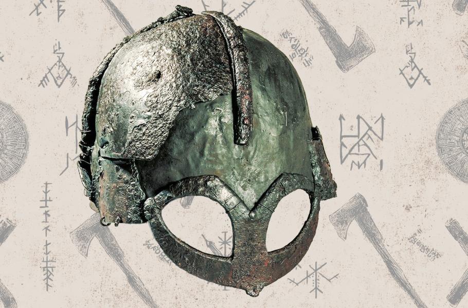 Helma z Gjermundbu v jižním Norsku s brýlovým hledím a malým nánosníkem je jedinou dochovanou přilbou z vikinského období nalezenou ve Skandinávii. (foto: Wikimedia Commons, NTNU Vitenskapsmuseet, CC BY 2.0)